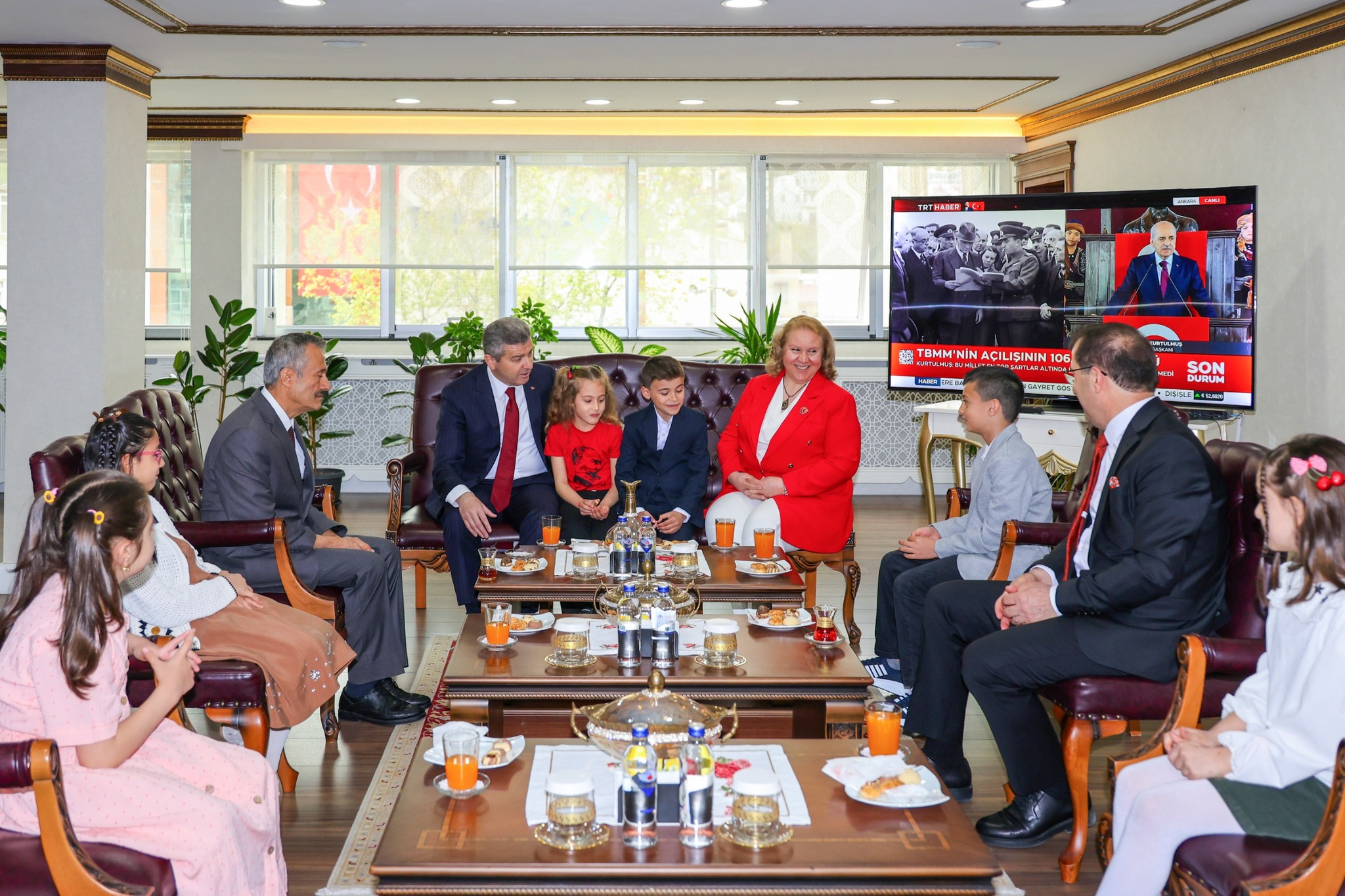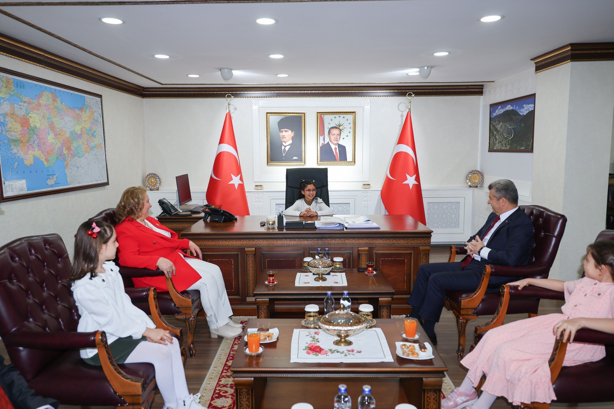 23 Nisan Ulusal Egemenlik ve Çocuk Bayramı dolayısıyla, İl Millî Eğitim Müdürü Fahri Acar eşliğinde 7 Mart İlkokulu öğretmen ve öğrencileri, Artvin Valisi Dr. Turan Ergün ve eşi Hülya Ergün'ü valilik makamında ziyaret ettiler.