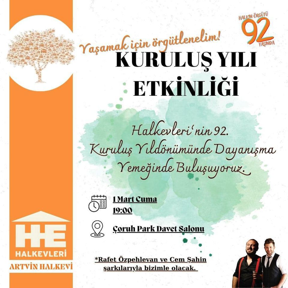 Halkevleri adına Artvin Merkez Şube Başkanı Uğur Karakuş yaptığı açıklamada “ Bilimle ,sanatla,direnişle geçen 92.yıllık çınarımızın kuruluş yıldönümünde bir araya gelelim.