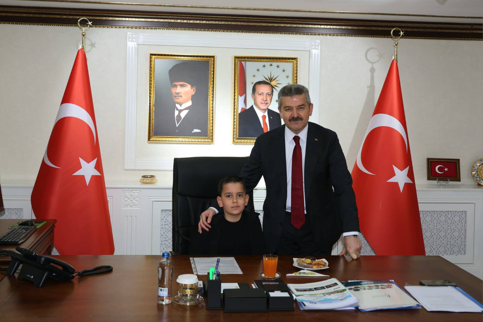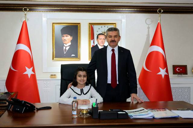 Ziyarette, temsili olarak makam koltuğunu 4. sınıf öğrencileri Hira Eren, Asel Zümra Arkadaş ve Mustafa Harmancı’ya devreden Vali Dr. Turan Ergün, dünyada çocuklara armağan edilen tek millî bayram olan 23 Nisan’ın önemine değinerek, istikbalimizin teminatı çocuklarımızın 23 Nisan Ulusal Egemenlik ve Çocuk Bayramı’nı kutladı.