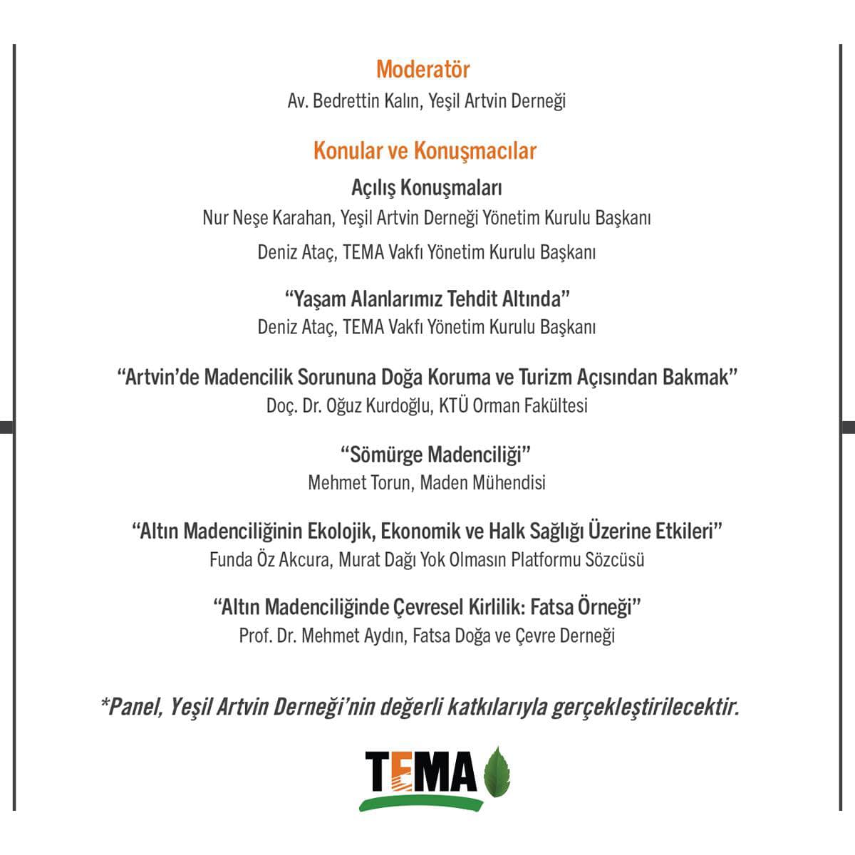 Panelin açılış konuşmasını ise Yeşil Artvin Derneği Başkanı Nur Neşe Karahan yapacak.