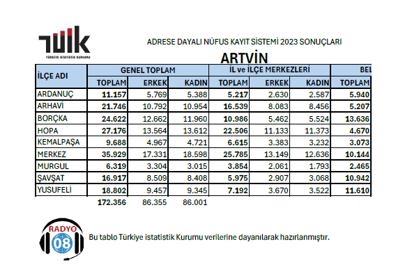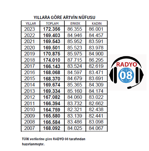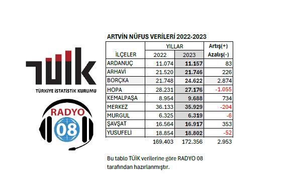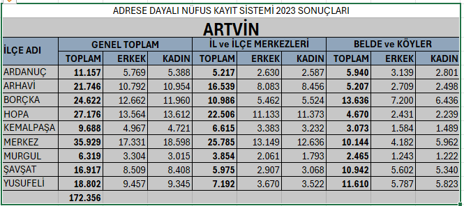 TÜİK verilerine göre 2022 yılı sonu itibariyle 169 bin 403 kişiden 2023 yılı sonu itibariyle Artvin’de yaşayan nüfus sayısı 172 bin 356 yükseldiği açıklandı.