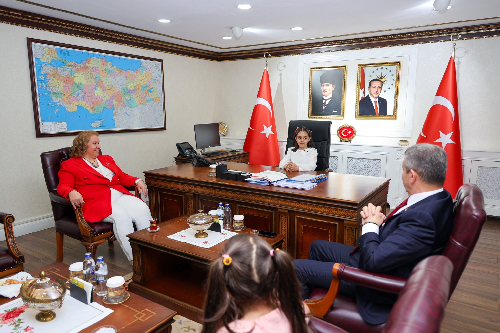 23 Nisan Ulusal Egemenlik ve Çocuk Bayramı dolayısıyla, İl Millî Eğitim Müdürü Fahri Acar eşliğinde 7 Mart İlkokulu öğretmen ve öğrencileri, Artvin Valisi Dr. Turan Ergün ve eşi Hülya Ergün'ü valilik makamında ziyaret ettiler.