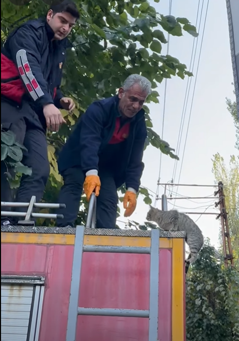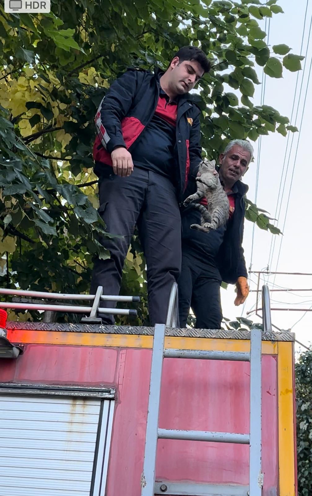 Harekete geçen itfaiye ekibi, ihbarın yapıldığı yere geldi. Ihlamur ağacına itfaiye aracını yanaştırdılar ancak yavru kedi korktuğu için ağacın diğer dallarına kaçtı. Bu kez itfaiye erleri aracın üzerine çıktı buradan da kediyi yakalamayınca bir itfaiye eri ağaca çıktı uzun uğraş sonucu kediyi yakalayarak aşağı indirdi.